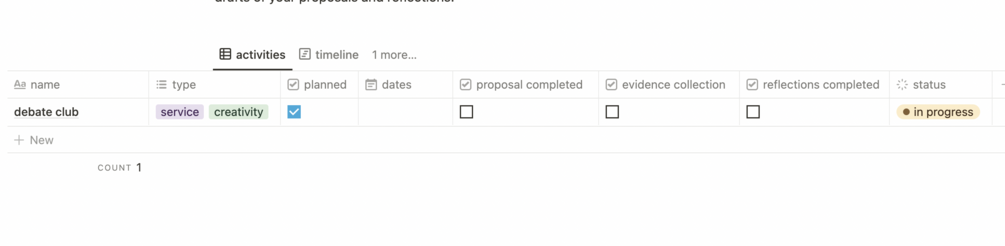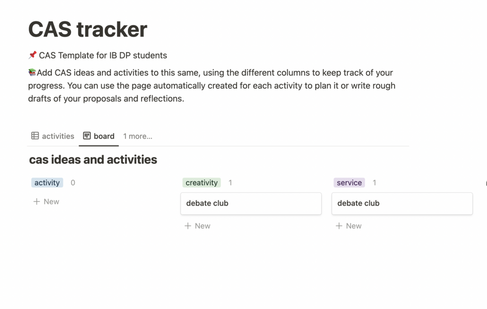 A Notion template to help IB DP students organize and keep tracker of their CAS activities and progress, to help them meet IB requirements for graduation.